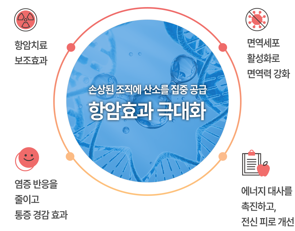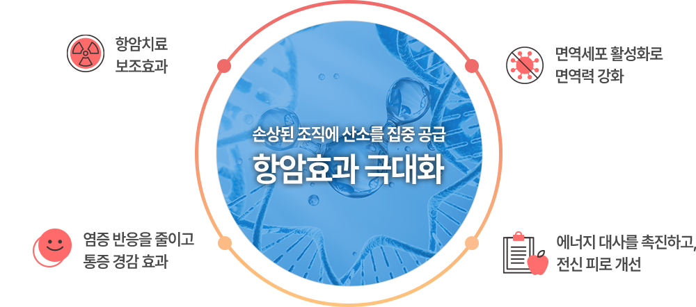 특히 방사선치료나 항암치료와 병행할 경우 산소 민감성을 높여 치료 효과를 극대화할 수 있으며, 방사선 후유증 회복에도 도움이 됩니다.