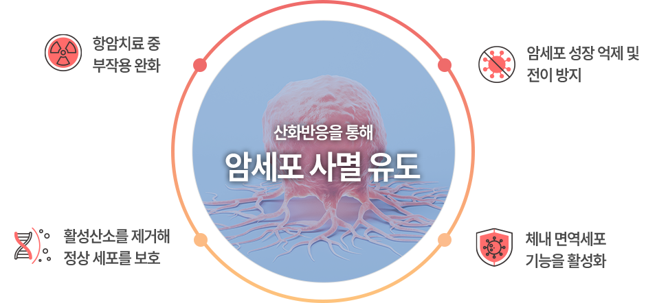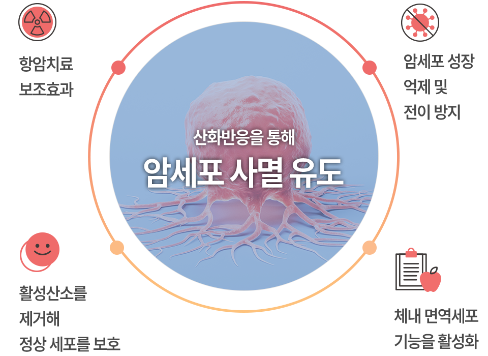 또한 강한 항산화 효과를 통해 항암치료 과정에서 흔히 나타나는 피로, 식욕부진, 염증, 면역력 저하 등을 완화하는 데 긍정적인 영향을 줍니다.